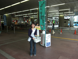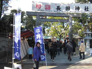 元旦に引き続き、長田神社前でご挨拶、まちこプレスを配布。