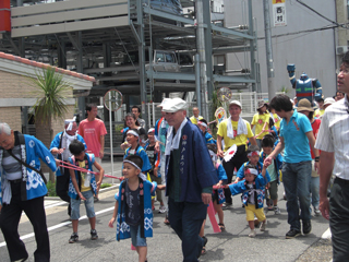 写真右奥に映っているのが、おみこしに飾られた手作りの鉄人28号。地域の有志の手による発泡スチロール削りだしの力作です。日の目を見て良かったですね。